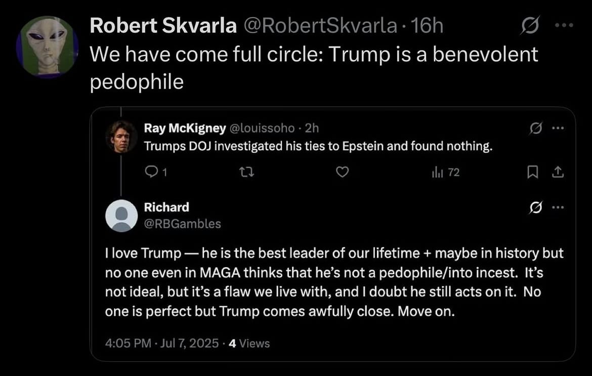 But hey, not everyone in the MAGA based is too hot and bothered about paedophilia.